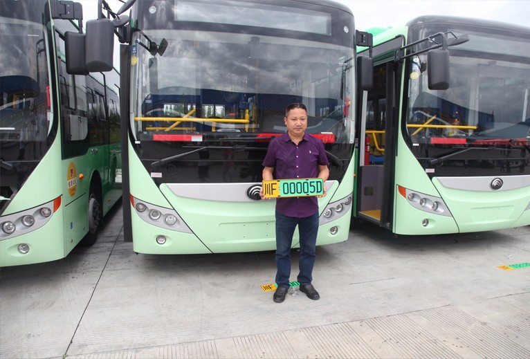 與小型新能源車不同的是,大型新能源汽車專用號牌底色采用黃綠雙拼色,前五位使用數(shù)字,第六位啟用字母,D代表純電動新能源汽車,F(xiàn)代表非純電動新能源汽車。新能源汽車號牌采用了新的防偽技術(shù)和制作工藝,含有防偽底紋暗記、二維碼、激光圖案等,號牌輪廓尺寸和普通汽車號牌也有不同。新能源車號牌與宏運公交的純電動公交車身綠色圖案相呼應(yīng),凸顯了綠色、環(huán)保、科技的理念。