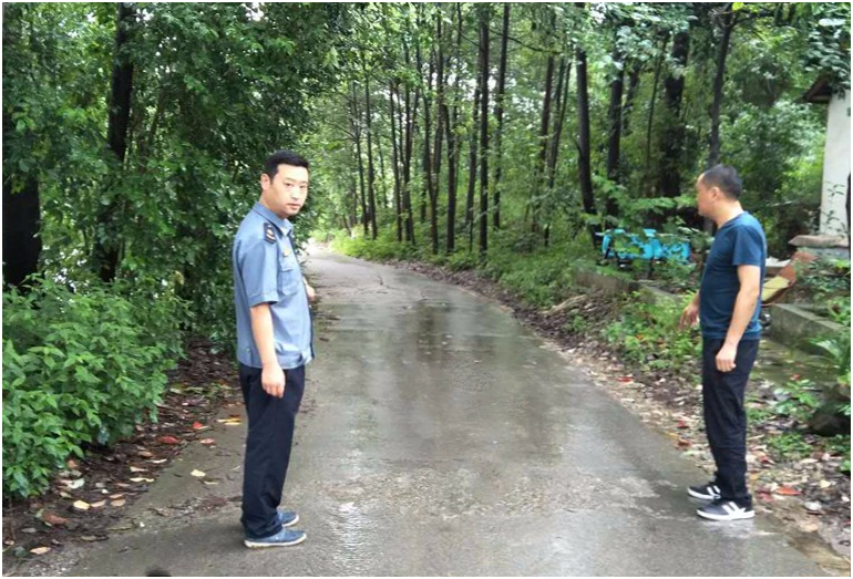 (市運(yùn)管所股長鄧銳查看東普村路段路面情況)