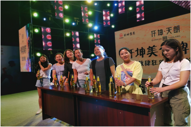 “六位啤酒一個組,兩瓶啤酒,誰最快飲下,誰就是冠軍!前三名獎品豐厚哦。”主持人向現場觀眾介紹著啤酒大賽的規(guī)則?,F場,貴州安順和綿竹兩地同時舉行啤酒節(jié),當互動屏幕打開時,兩地參賽者同時舉起酒瓶開始比拼模式,雖隔著屏幕,亦能感受激烈精彩的氛圍。“加油,雄起……”臺下兩地觀眾不停地為臺上的參賽選手鼓勁、打氣。“16秒,我們的冠軍產生啦!啤酒大人李文僅用了8秒就喝完了一瓶750ml的啤酒,兩瓶酒16秒就喝完了,真是高手在民間啊。”伴隨著主持人宣布大賽的成績,大家都舉起手中的酒杯,為冠軍喝彩。被盛邀參加啤酒節(jié)的貴州安順人楊昌倫表示,仟坤集團特意邀請了貴州安順的業(yè)主和表演團隊來到綿竹,兩地同時舉行啤酒節(jié),現場互動,既豐富了本地的文化生活,又吸引了很多外地朋友,讓更多的人了解仟坤,仟坤有實力,作為業(yè)主感到自豪。